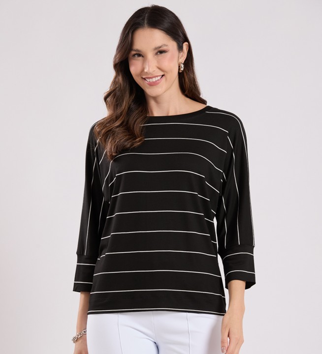BLUSA EM MALHA VISCOSE DE LISTRAS. MODELO LEVEMENTE AMPLO PARA UM TOQUE DESPOJADO E MODERNO. DECOTE CANOA E MANHAS 3/4 COM PUNHOS.