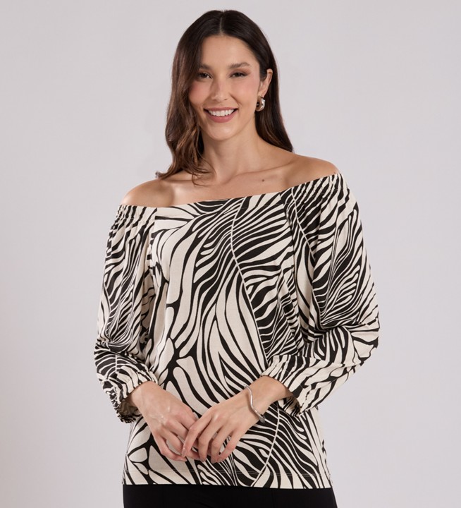 BLUSA EM MALHA VISCOSE ESTAMPADA. DECOTE QUADRADO COM ELÁSTICO NOS OMBROS. MANGA 7/8.