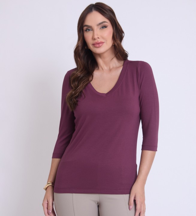 BLUSA DE MALHA VISCOLYCRA LISA BÁSICA DECOTE EM V.