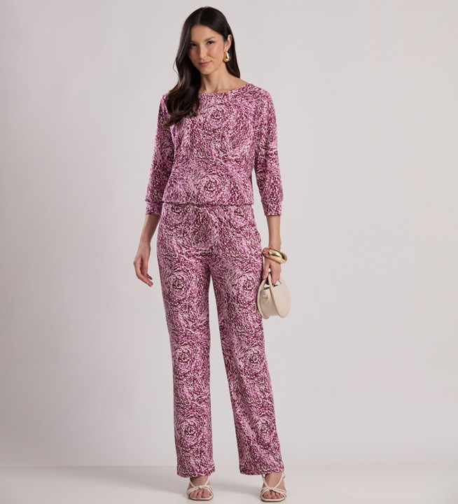 CALÇA EM MALHA FLUITY ESTAMPADA COM ELÁSTICO NA CINTURA. PERNAS RETAS. BOLSOS FUNCIONAIS LATERAIS E TRASEIROS.
