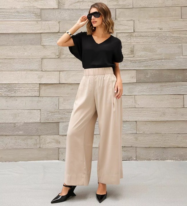 CALÇA PANTALONA EM LIOCEL. CÓS DE ELÁSTICO EMBUTIDO. BOLSOS LATERAIS E TRASEIROS.