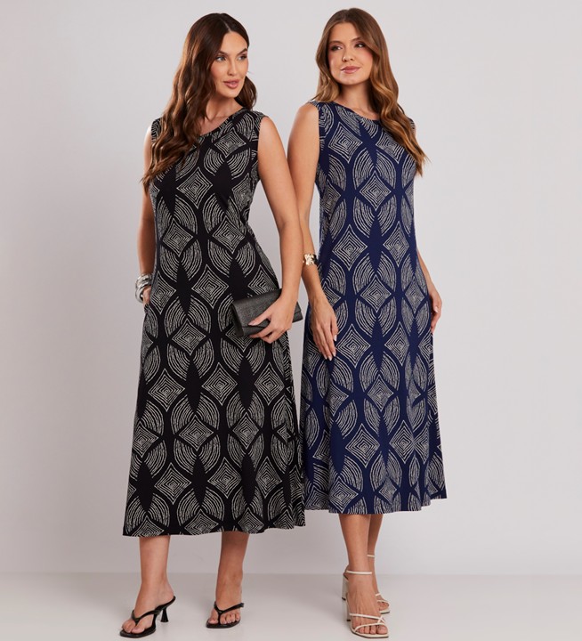 VESTIDO EM MALHA VISCOLYCRA ESTAMPADA. MODELO REGATA DE CAVAS LARGAS, DECOTE REDONDO. SAIA EVASÊ DE COMPRIMENTO MIDI E BOLSOS LATERAIS FUNCIONAIS.